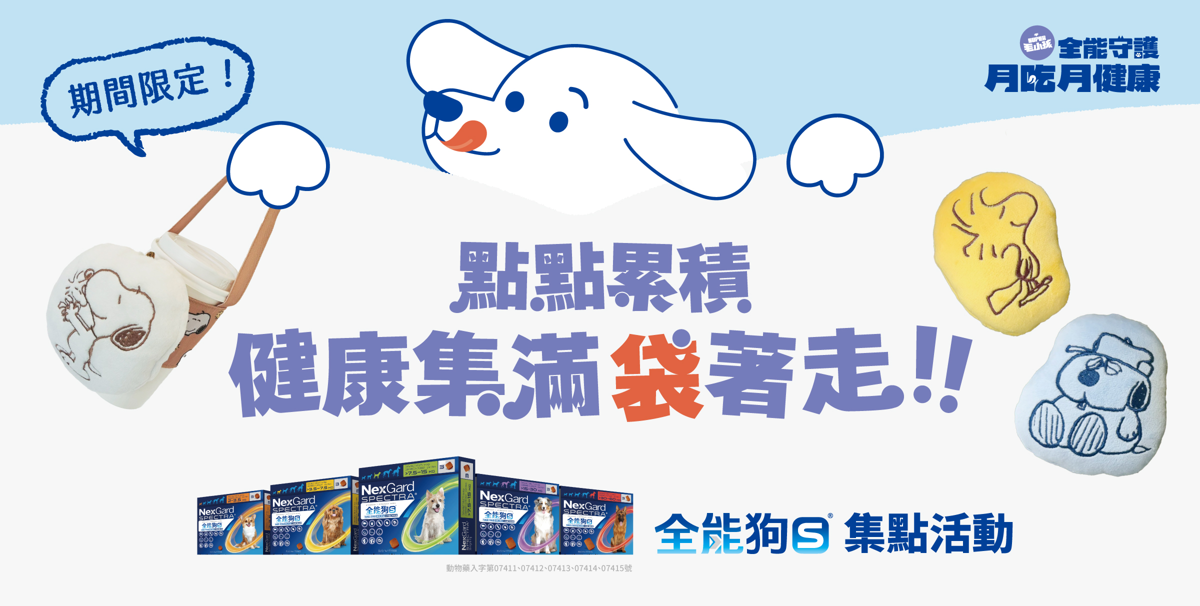 2025/8/5(二)至2025/10/16(四)期間購買全能狗S(不限包裝),並於Super全能毛小孩集點平台完成集點,即可於指定通路兌換SNOOPY家族絨毛玩偶杯袋(共3款)。
